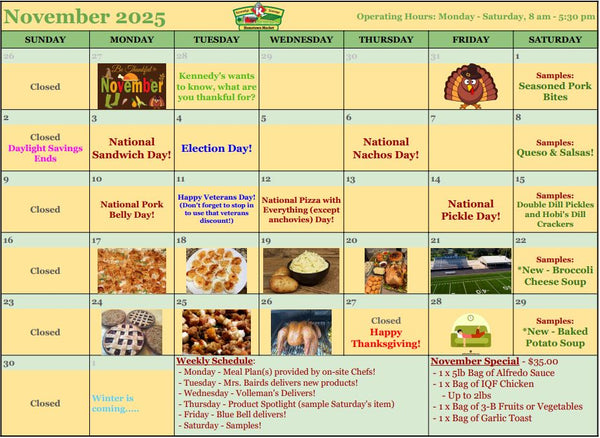 At Kennedy's Sausage Hometown Market we are known for our exceptional sausage, bacon, and pit hams. We also have Farm to Market Foods making premium quality soups, sauces, and entrees on-site!